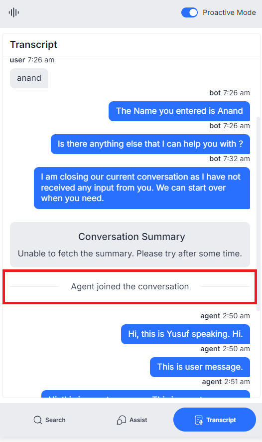 The Transcript tab shows the transcripts of the User-AI Agent conversation if they exist. It displays a summary of the conversation to give pre-context to the Agent and to show the live transcripts of USER and AGENT during voice conversations.