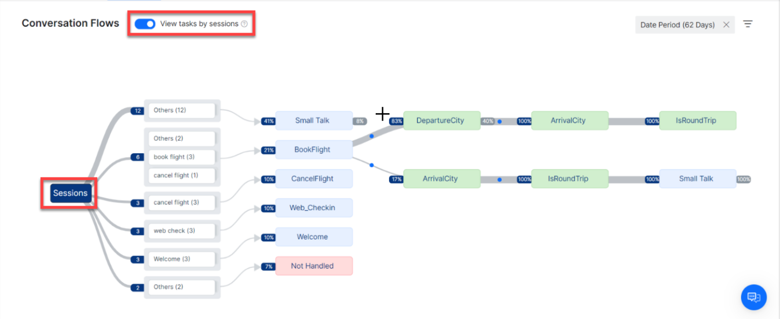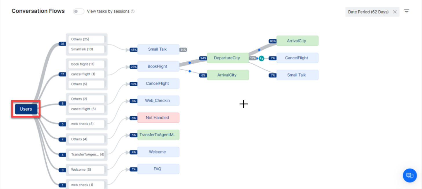 - Session Flow: This view provides the user journey across the different intents in the order they were executed during a conversation session. Every flow starts with the intent used to initiate a conversation session and is followed by the other intents invoked in that session. You must turn ON the View Tasks by sessions toggle to access this view.