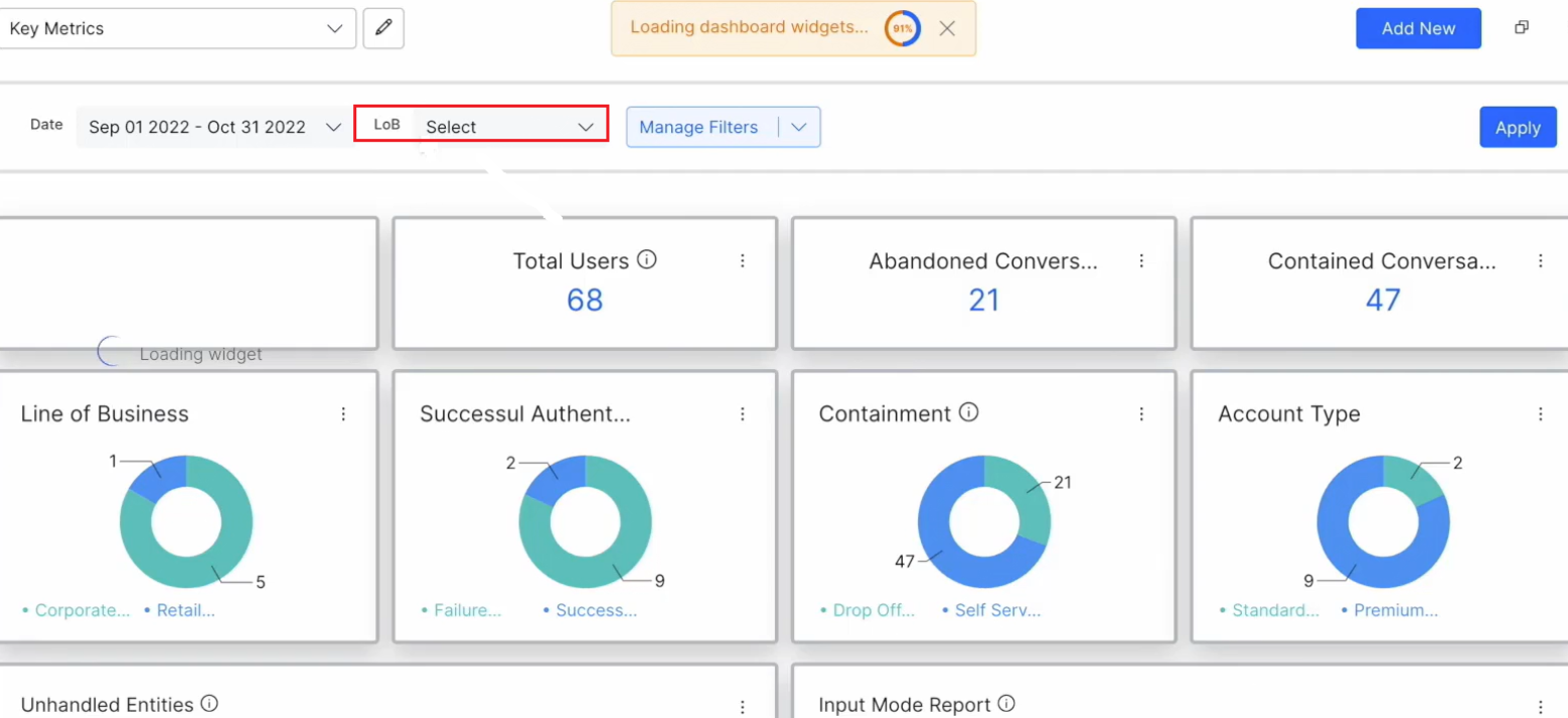 The default filter is added at the dashboard level (highlighted in the screenshot) and you can select the value from the LoB drop-down to apply to all the widgets.