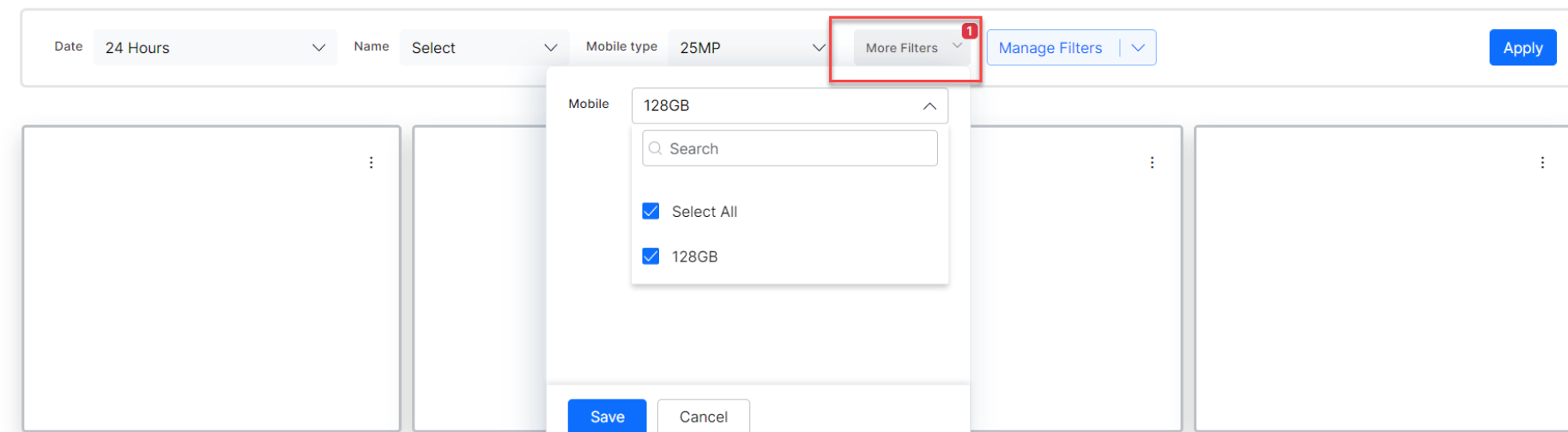 If more than two filters are added to the dashboard, then they are displayed in the More Filters drop-down next to the first two added filters.