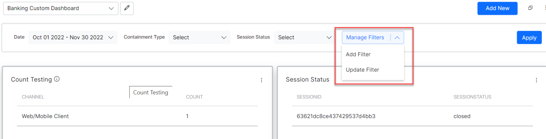 To add one or more filters at the Custom Dashboard level, perform the following steps: