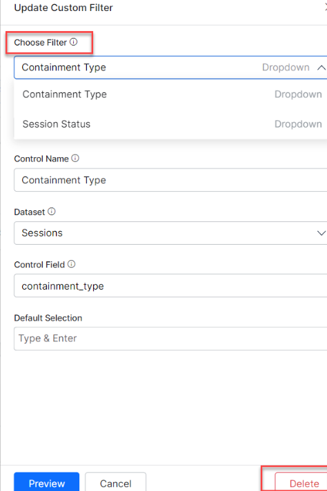 In the Update Custom Filter panel, select the filter to be deleted from the Choose Filter drop-down.