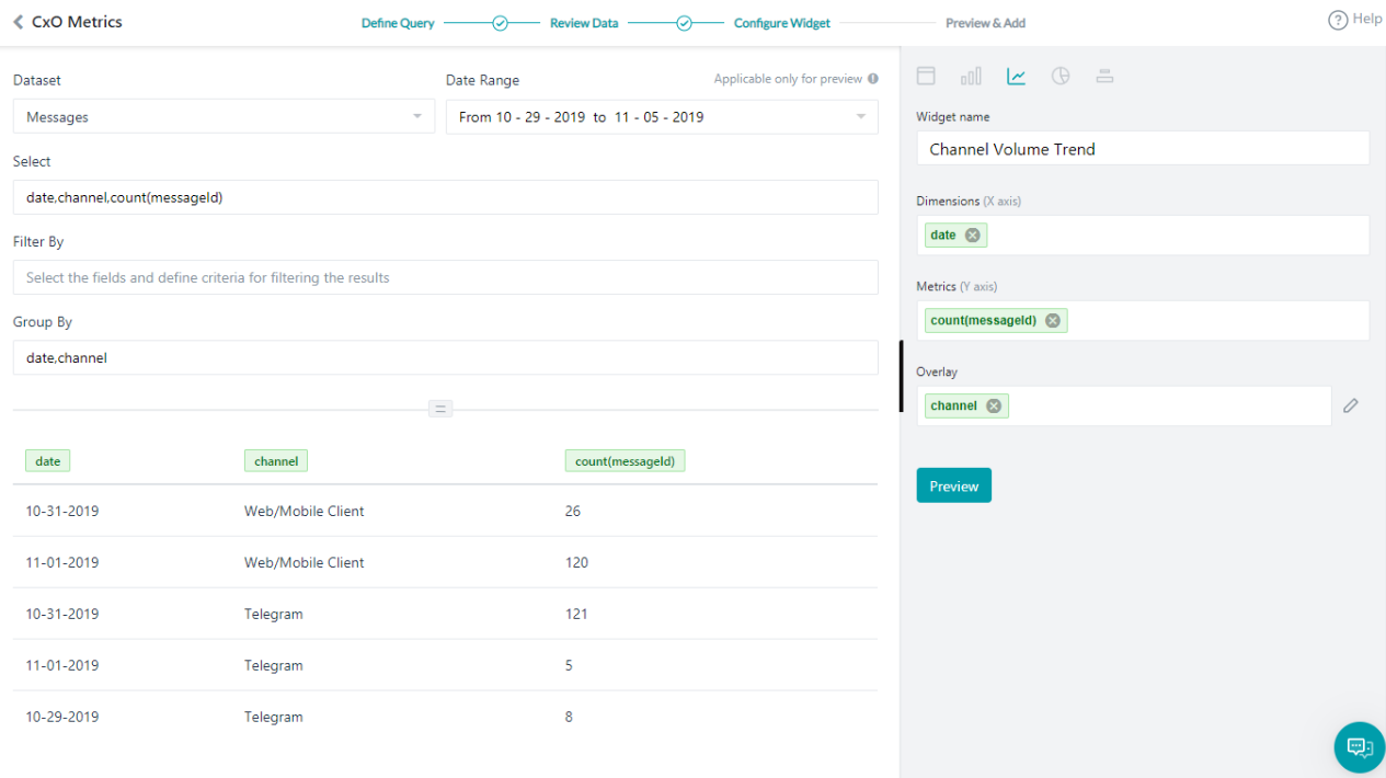 - Select: date,channel,count(messageId)