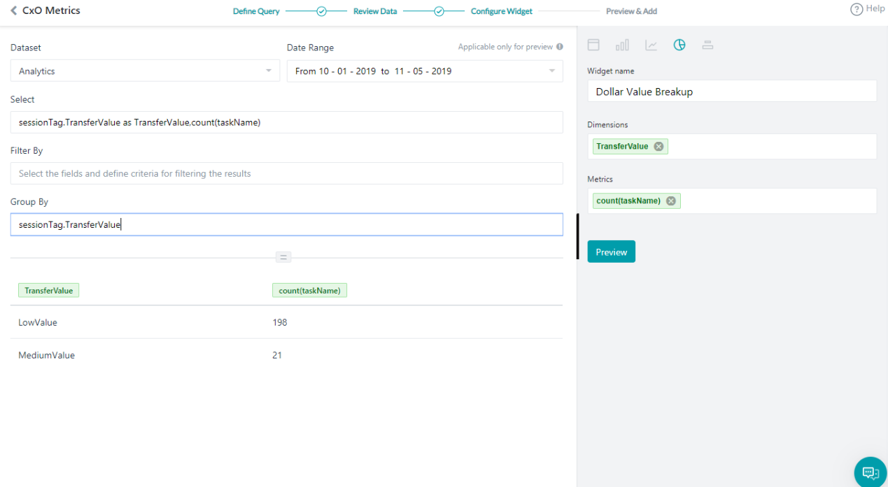 - Select: _sessionTag.TransferValue as TransferValue, count(taskName) _This will let the platform know what data to fetch. Here we are using the session tag values added to the Transfer Amount task against the total number of tasks executed.