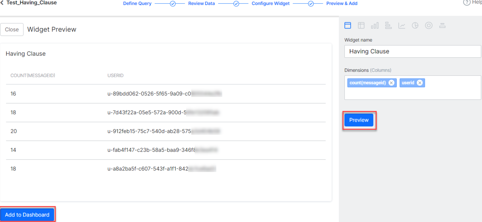 The Having clause widget is added to the dashboard as shown in the following screenshot.