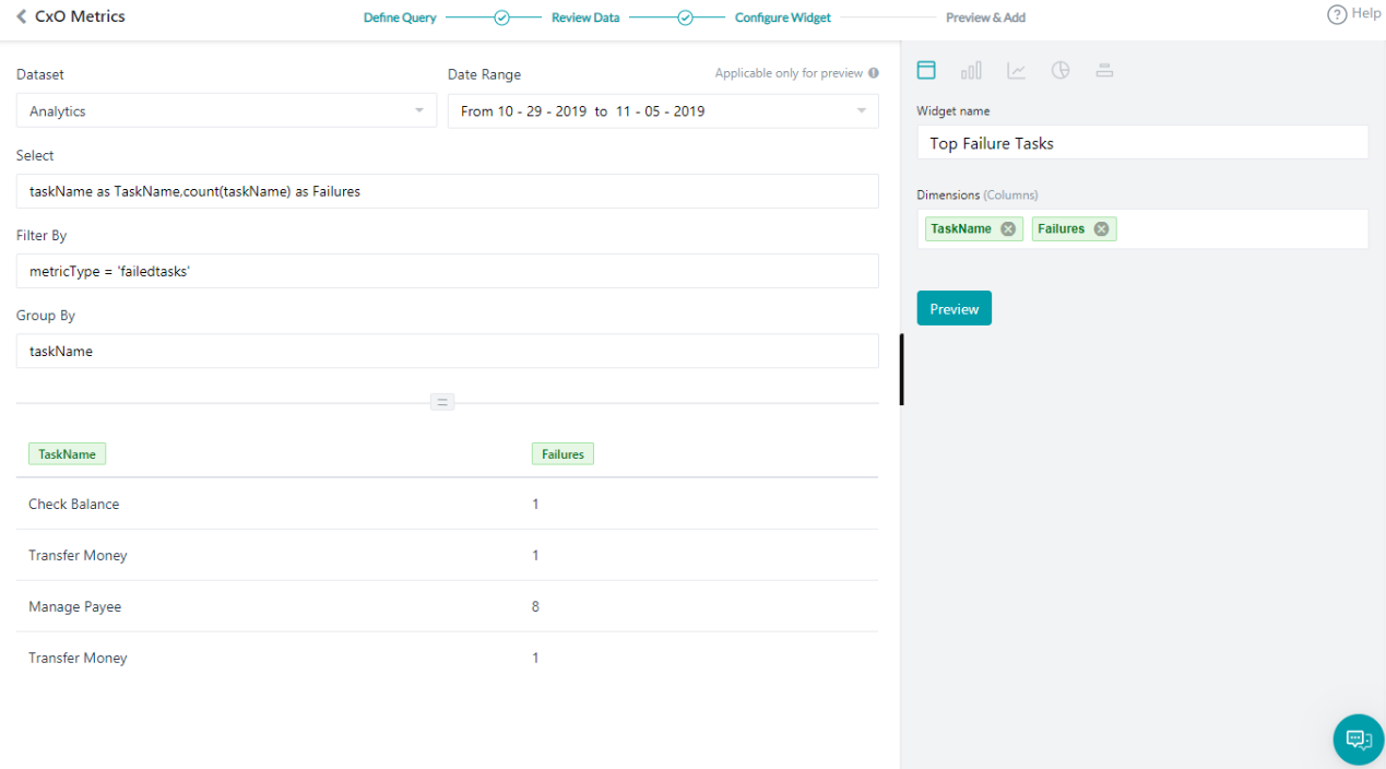 This query provides the top tasks that are failing. Repeat the steps listed in the previous section with the following details: