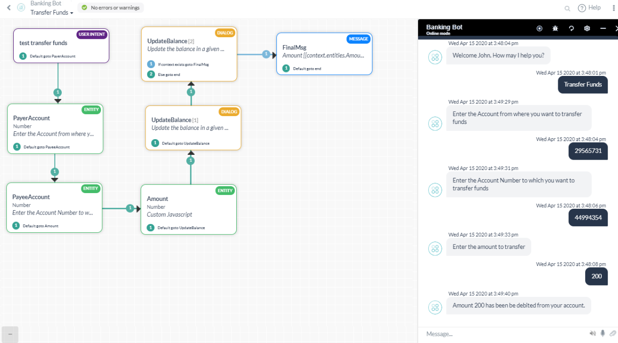 Transfer Funds: The Dialog task walks the user through the transfer steps.