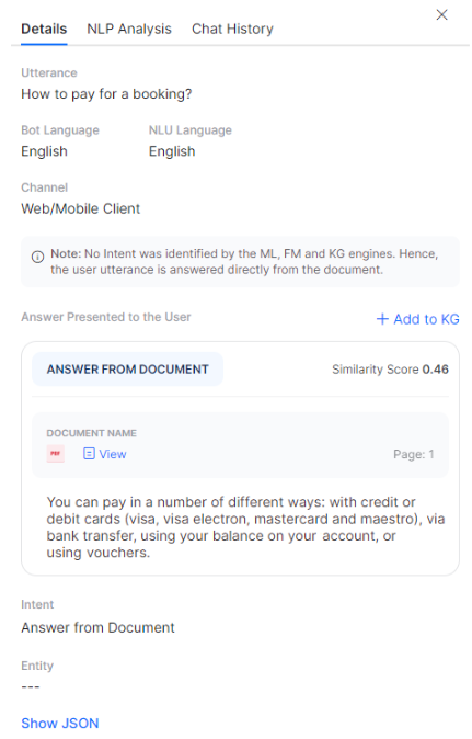 - Information on the Intent not being identified by the ML, FM, and KG engines. Hence, the user utterance is answered directly from the document.