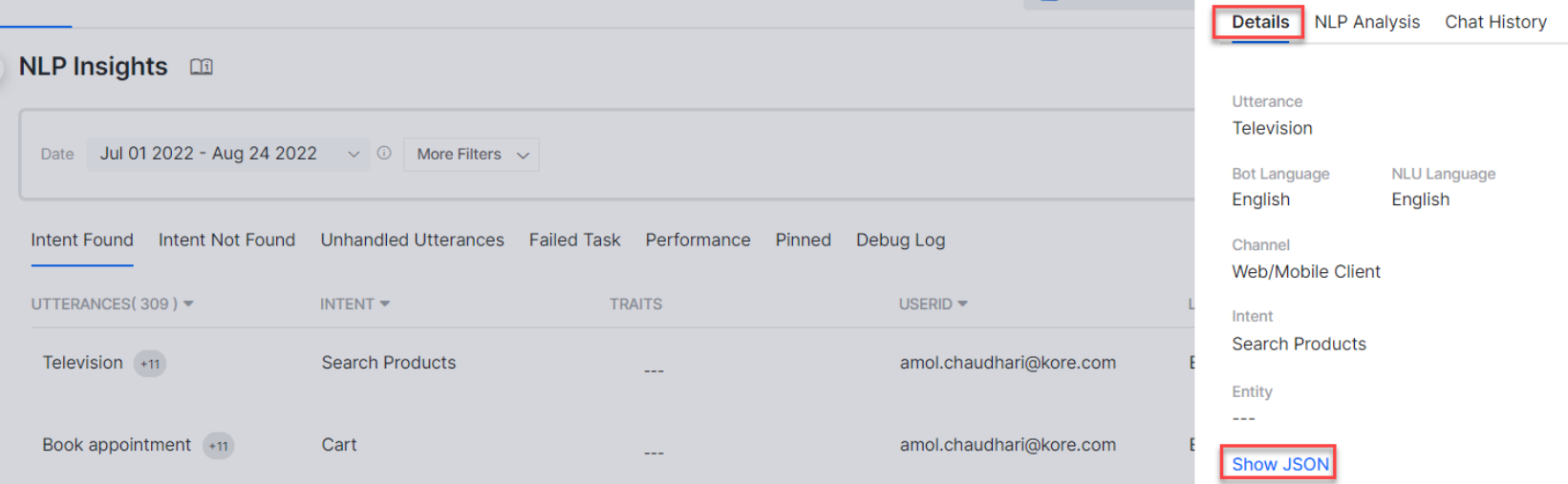 For all the user utterances listed on the various tabs such as Intent Found, Intent Not Found, Unhandled Utterances, etc., you can open more details of the user session by clicking the respective record. The record shows the information on the following sub-tabs: Details, NLP Analysis, and Chat History.