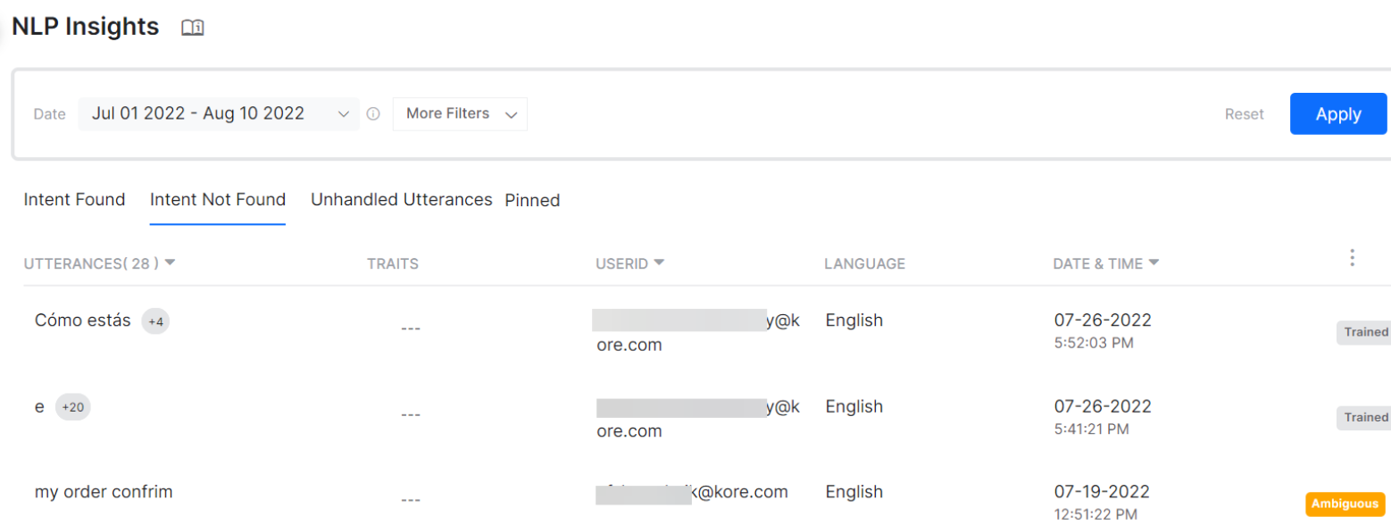 | Traits | All the traits that are identified for the listed utterances. The details on the tab can be grouped by traits. By default, the Group by Traits option is turned off. To turn it ON, click the Traits header and enable the Group by Traits option.
