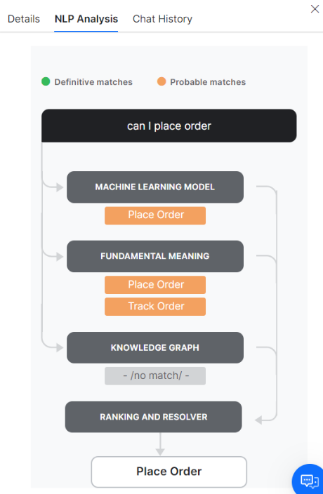 This tab provides a visual representation of the NLP Analysis, including intent scoring and selection. See Testing and Training an AI Agents and Ranking and Resolver for more information.