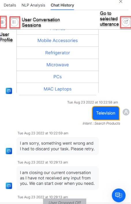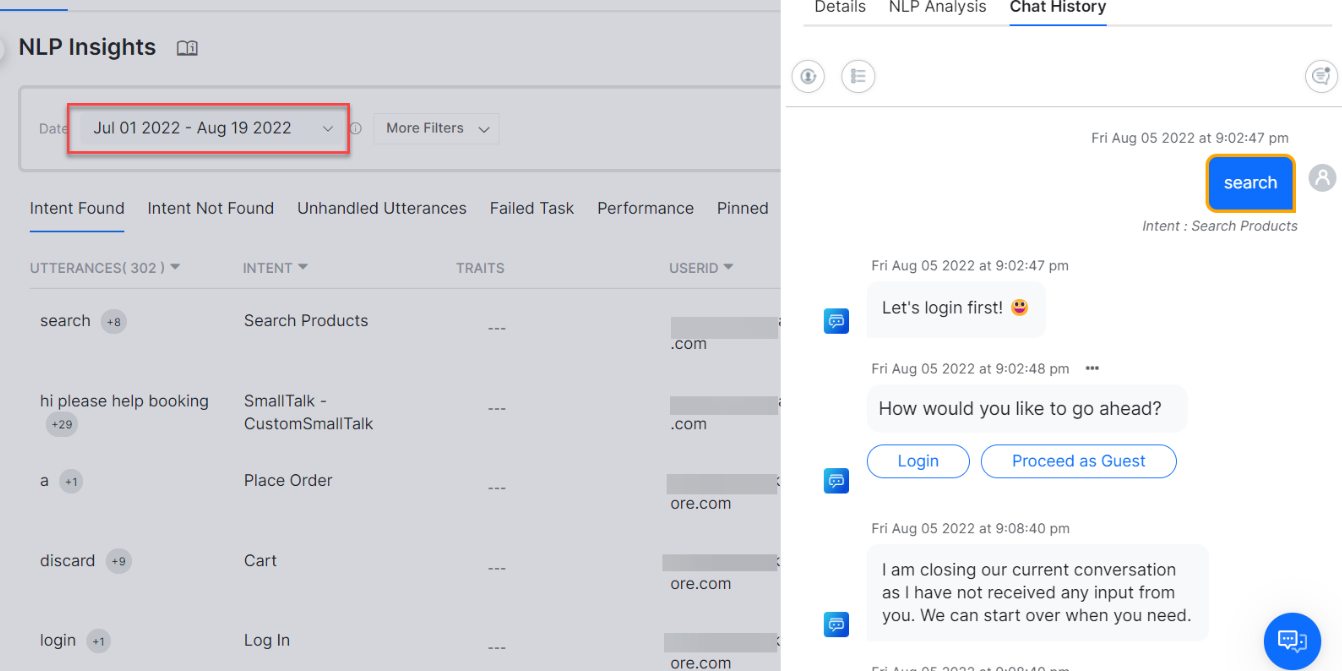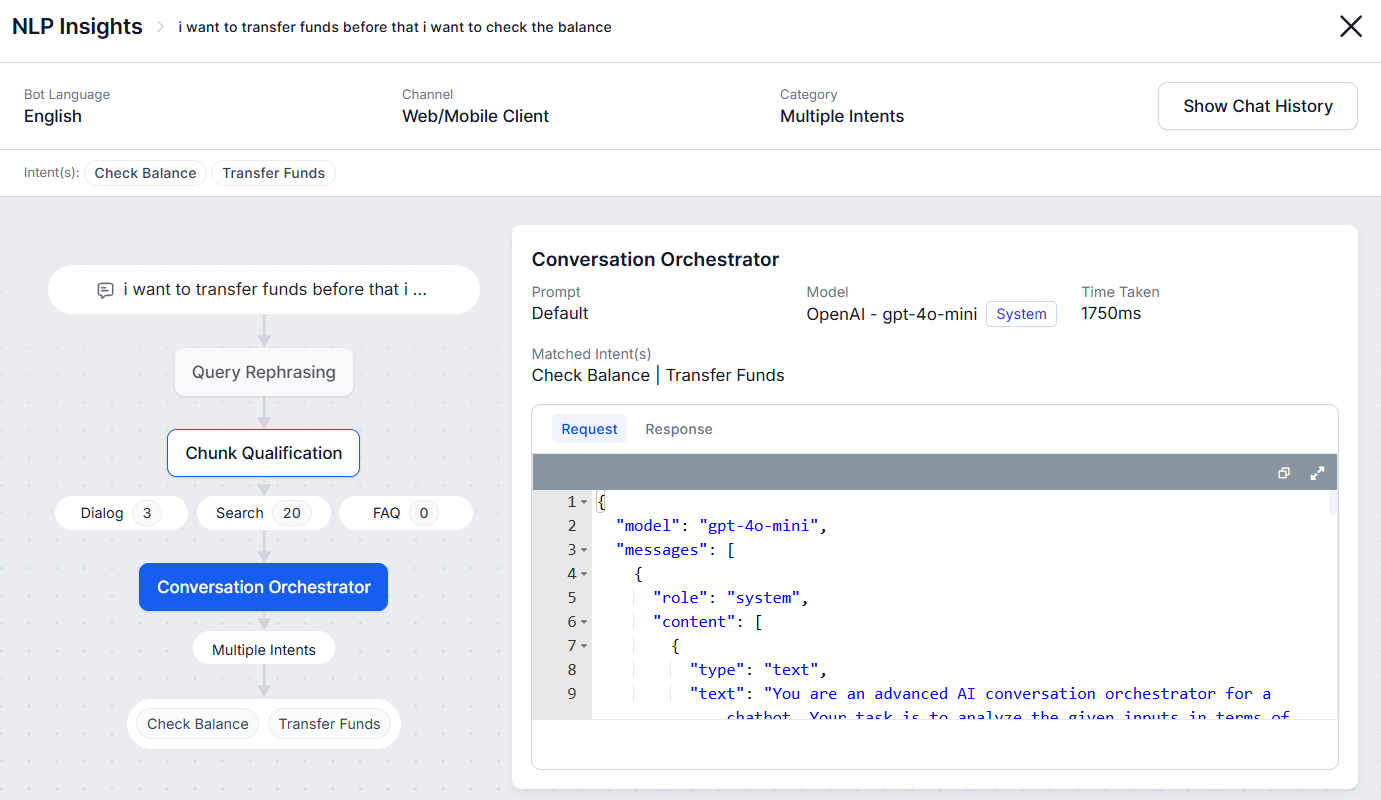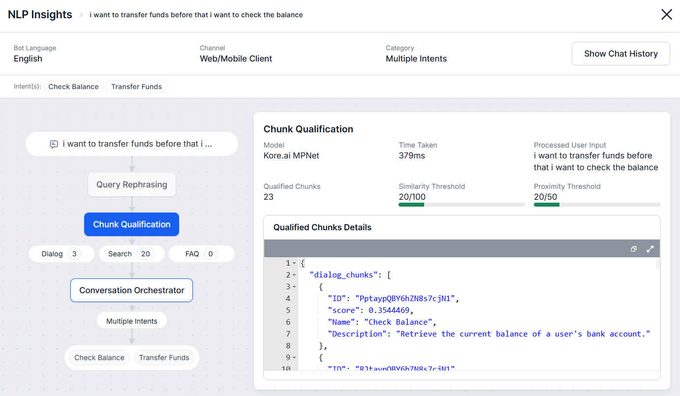 The Chat History tab allows you to access the exact message or conversation for which the record is logged. It also shows the entire chat history of the user session, as well as the intent and intent category.