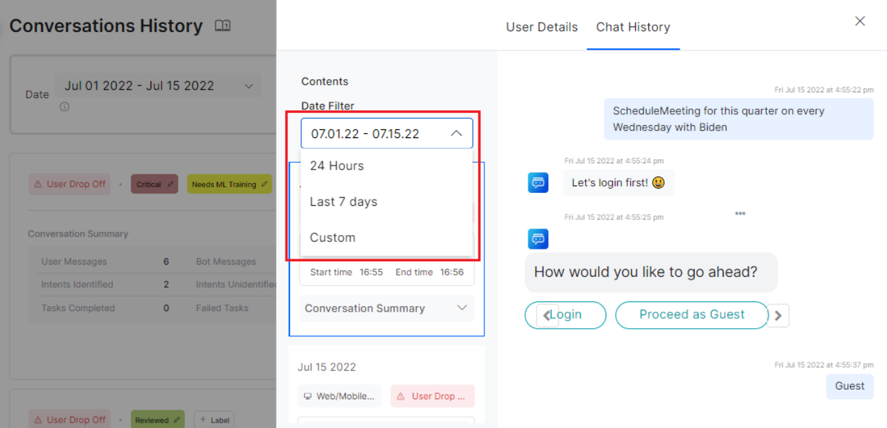 On the Chat History tab, you can access the exact message or conversation for which the record is logged. It shows the entire chat history of the user session.