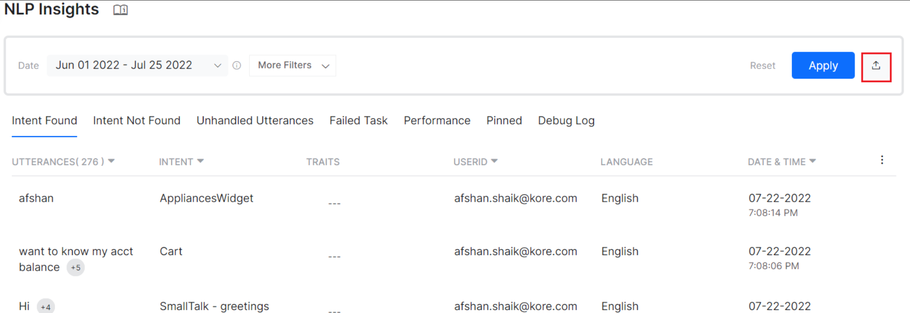 You can export the data present on the NLP Insights page to a CSV file, by clicking the Export icon on the top right corner of the page.