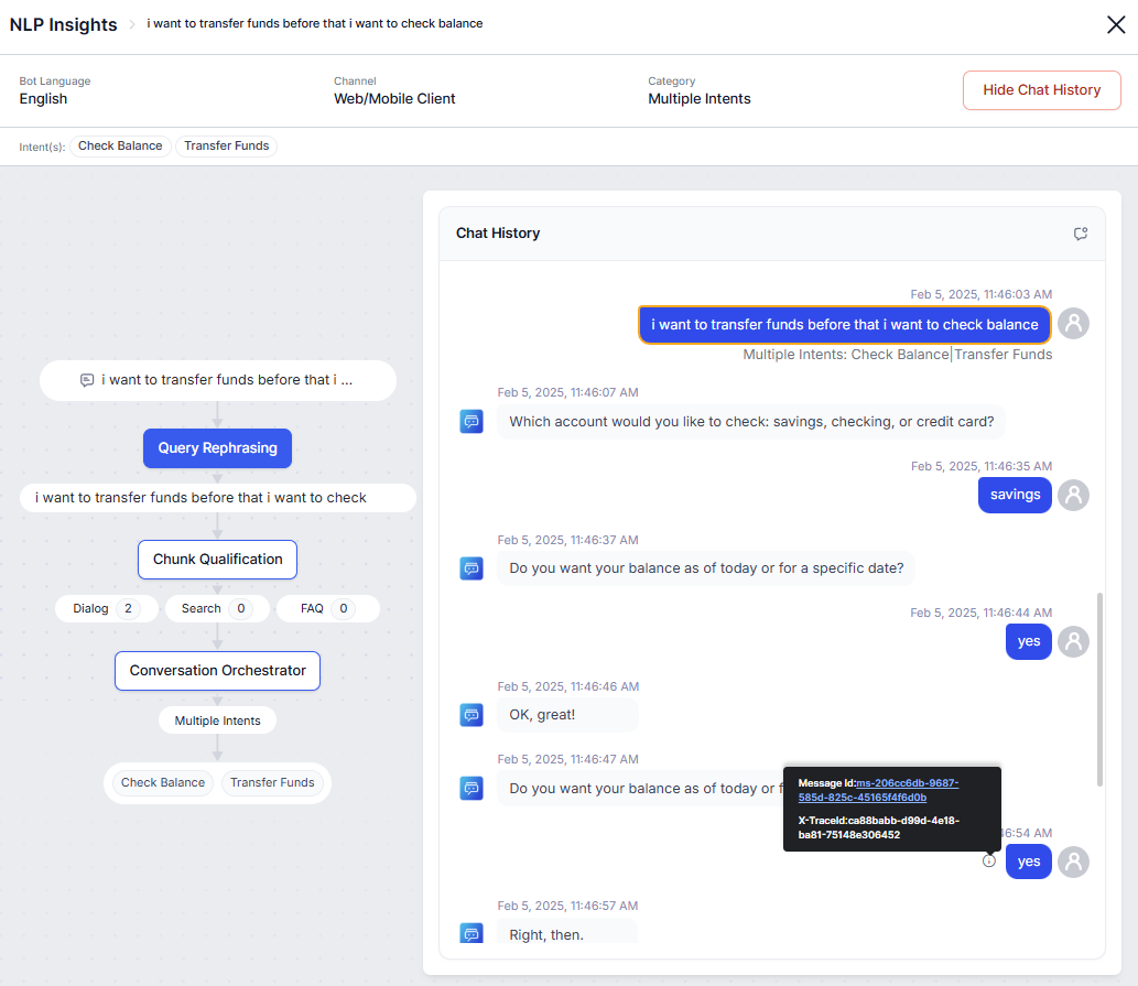 - Click the Message Id to view the X-Trace Id and K-Trace Id associated with a message in the Chat History.