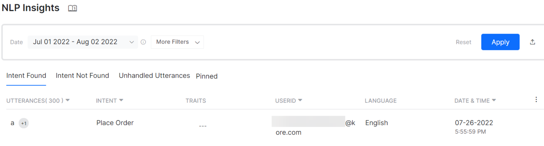An intent refers to the goal the customer has in mind when typing in a question or comment. The phrases used to express the intent are called user utterances. The Intent Found tab includes all the user utterances identified by the platform.