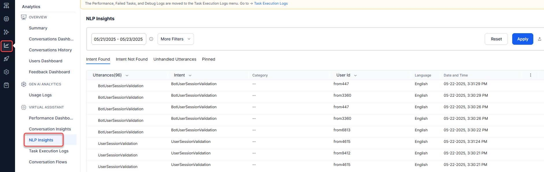 In the latest version of the Platform, the NLP Insights section retains only the NLP-related analytics data for task identification. The new Task Execution Logs section displays the analytics data related to a AI Agent’s task execution.