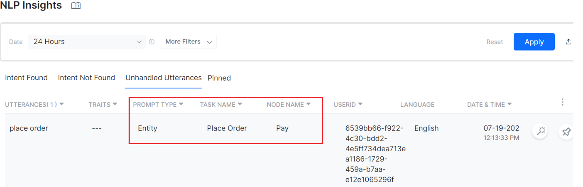 - Task Name – Name of the task in which the utterances are unidentified on an entity, message, or confirmation nodes.