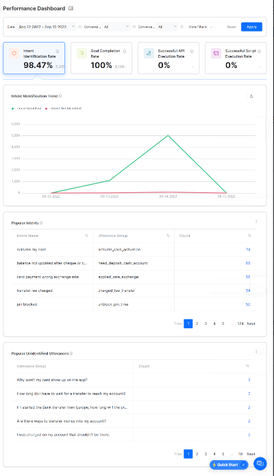 The Performance Dashboard provides insights to understand the AI Agents’s NLP performance and integration metrics. The Performance Dashboard is categorized into four categories to identify how an AI Agent performs. These categories are mentioned below: