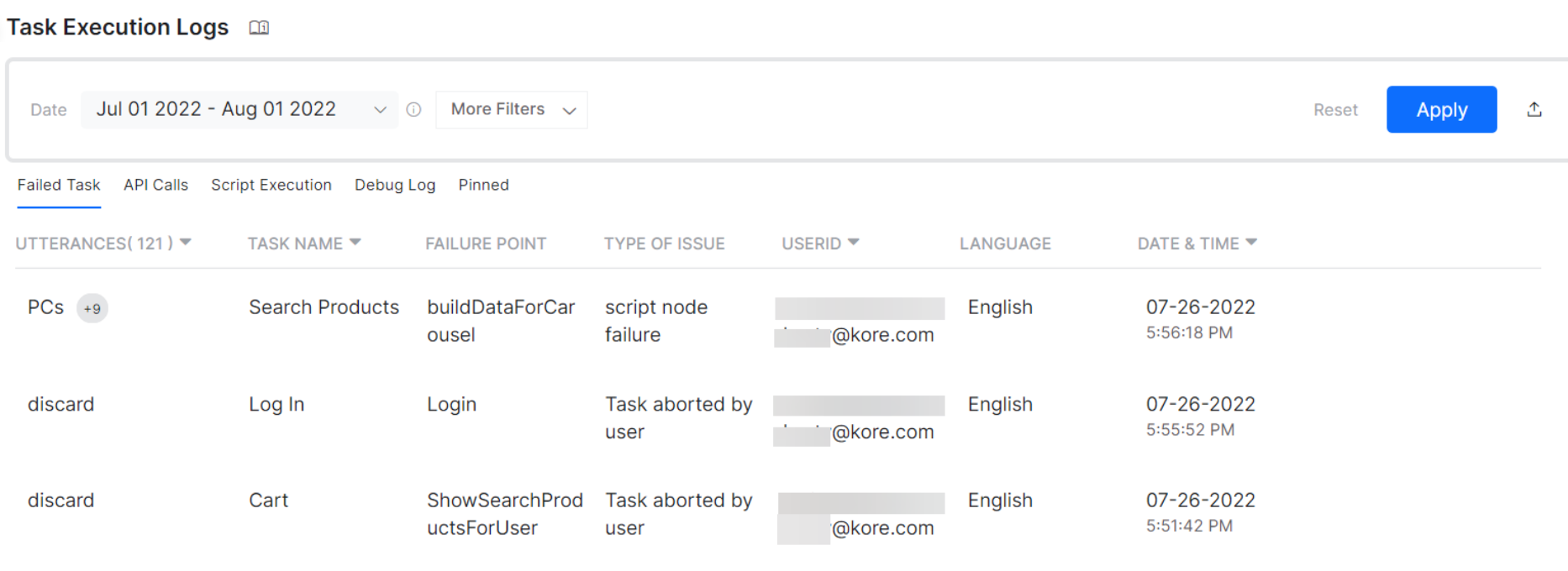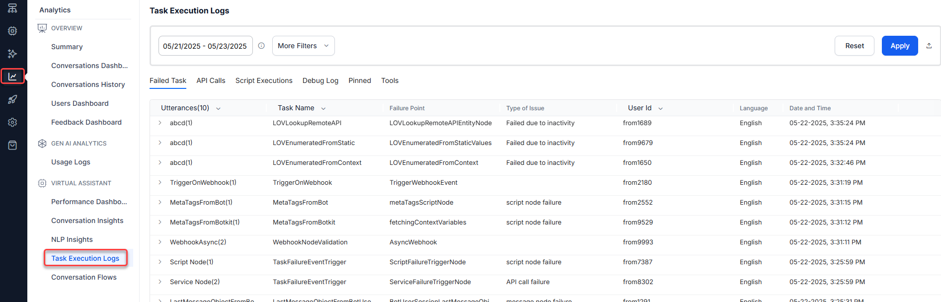 - Complete meta-information is stored for later analysis, including the original user utterance, the channel of communication, entities extracted (if any), custom tags applied, and detailed Task Execution Logs.