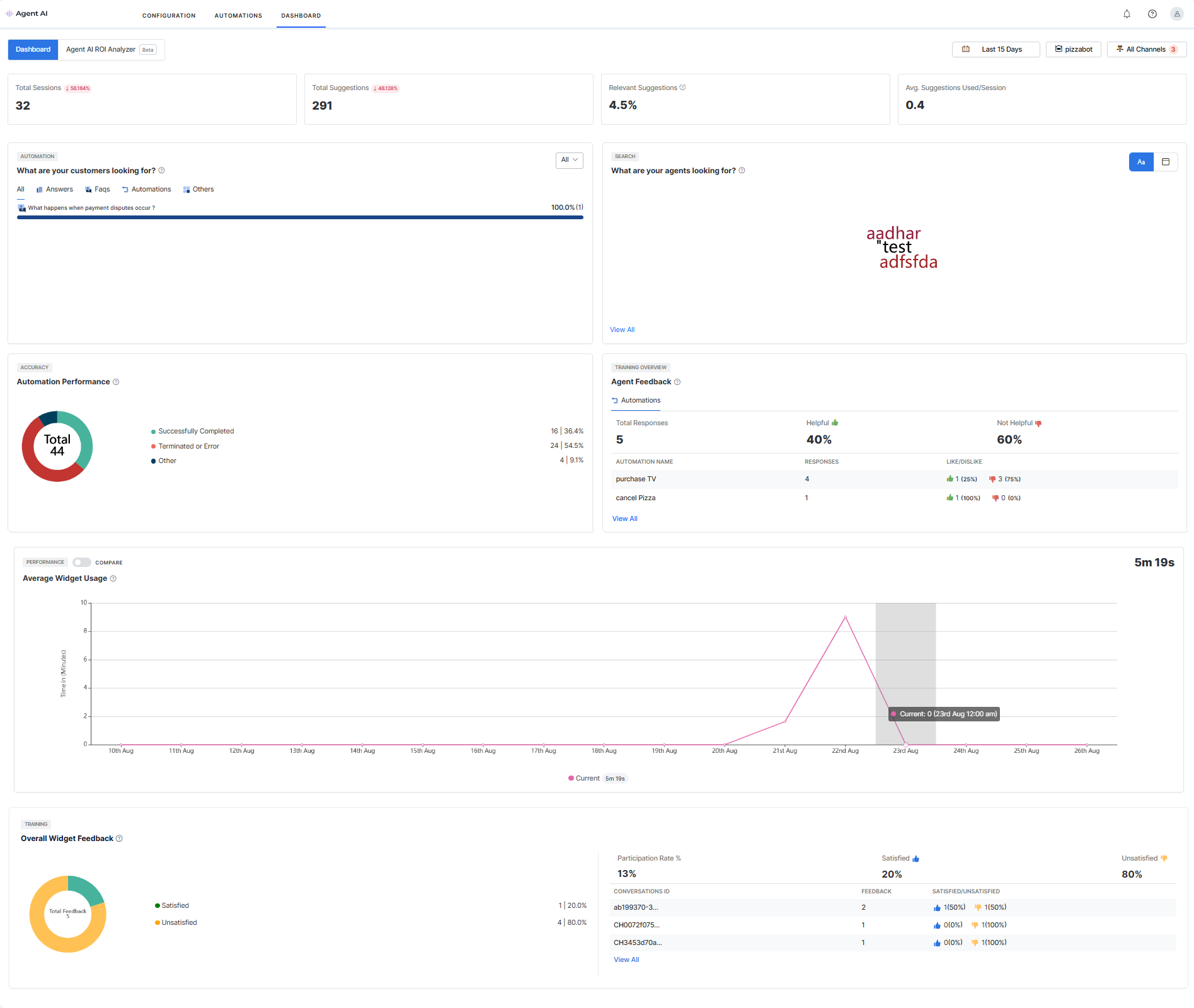 This section lets you view and filter the Agent AI Widget’s performance data.