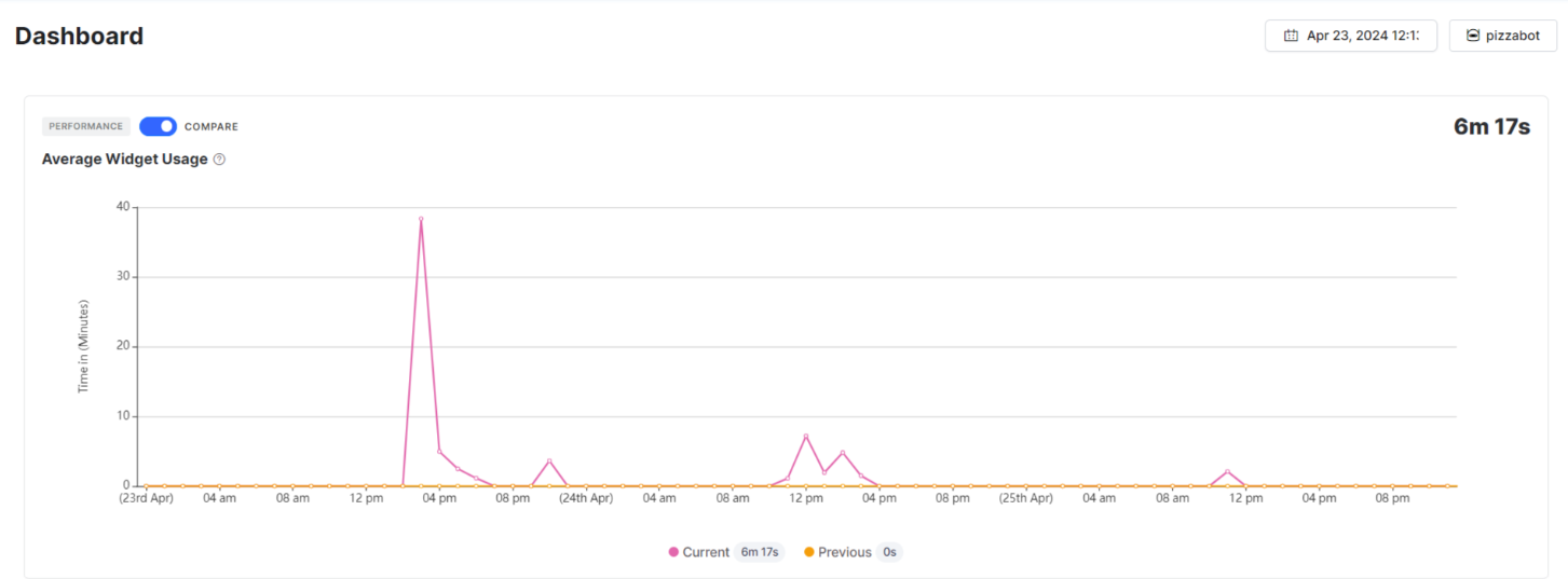 This feature gives a graphical representation of the average amount of time agents spend on the Agent AI widget and is applicable only for the third-party agent desktops. You can use the Compare button to compare the data you have selected for a time period in an “n-1” formula. For example, if you have selected “30 days,” last 30 days’ data is compared with the previous 30 days’ data.