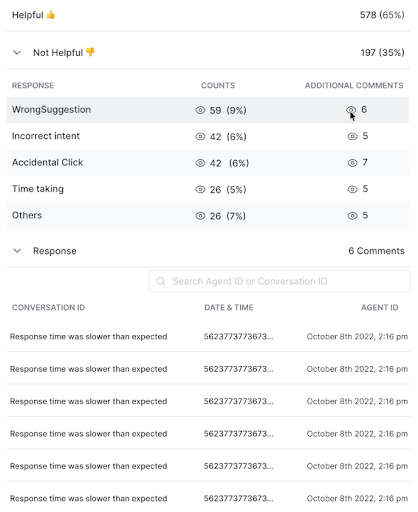 This section shows the top three most disliked automations by agents in descending order of dislike percentage. Agent AI gets this data by capturing the likes or dislikes at the end of a dialog task. You can have a detailed summary of Agent Feedback for dialog tasks, including “Not Helpful” feedback and Additional Comments. The detailed view of the “Not Helpful” feedback includes Responses, Additional Comments, and Counts. You must select View All to view further details of a dialog task.