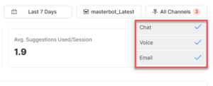 The default setting of the Agent AI Dashboard shows the combined data of all three channels–Voice, Chat, and Email. To filter data by channel, select the All Channels button on the top-right corner, and then select against a channel to select or clear it from the dropdown list.