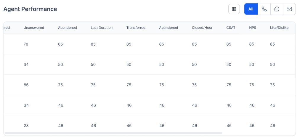 This section displays agent performance metrics for all conversations (call, chat, e-mail).