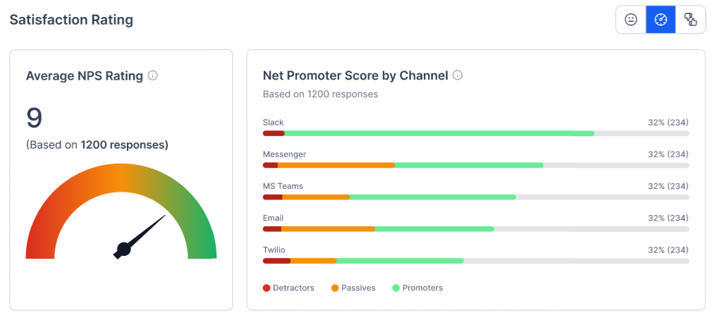 Satisfaction Rating: Displays the results of the selected feedback survey (CSAT, NPS, Like/Dislike).