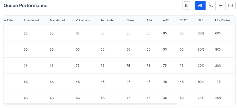 This section displays queue performance metrics for all conversations (call, chat, e-mail).