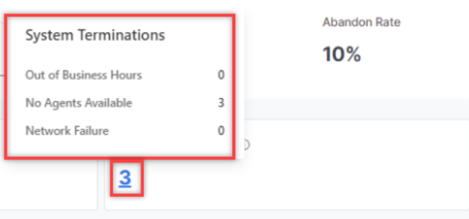 System Terminations: Count of conversations terminated by the System. This metric appears based on selected queues only. Clicking on the number displays the details of the system terminations.
