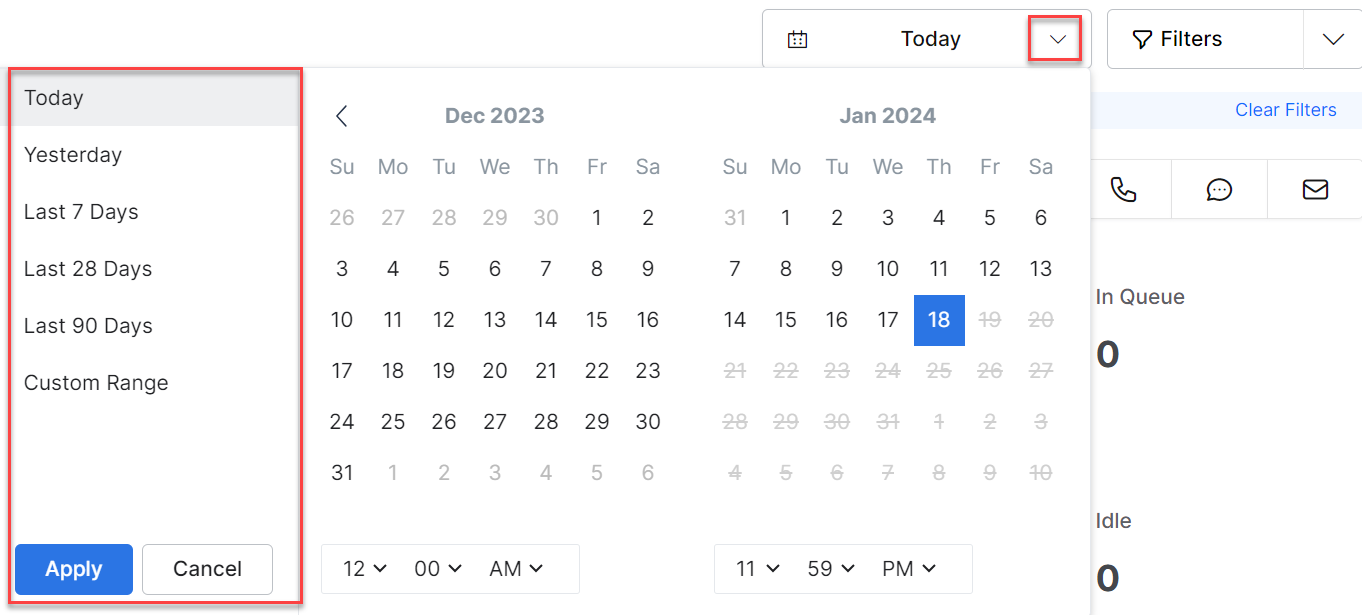 You can filter Queues & Agents data for a specific time range. You can choose a particular time range and select Apply.