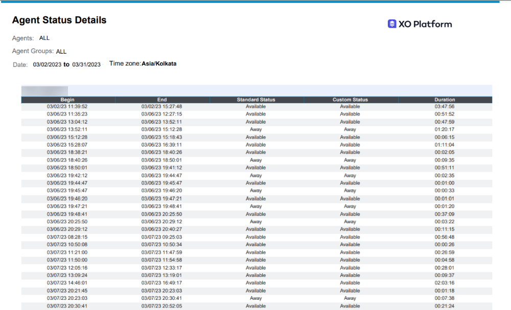 | Duration | Time for which the Agent’s status was marked Busy. | NNN:NN:NN (“323:21:23”) |