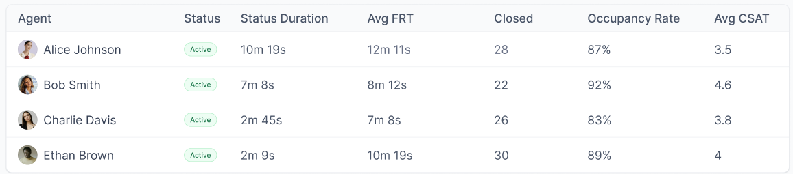 Name Description Agent The name and display picture of agents. Status Current status of the agent. Status Duration How long the agent has been in the current status (format: NNNh NNm NNs). Avg. FRT Average First Response Time of the agent. Closed The number of conversations properly closed by the agent. Occupancy Rate The percentage of an agent's logged-in time that's spent actively handling conversations.