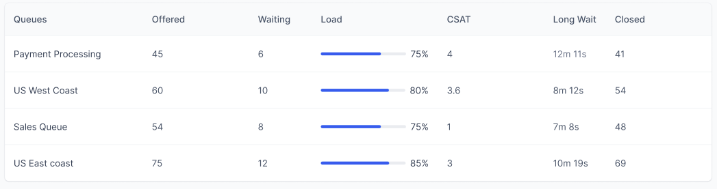 Name Live/Time based Description Queues NA Names of the configured queues. Offered Time-based Count of all conversations offered in the queue. Waiting Live Count of all conversations waiting in the queue. Load Live The current load on the queue in percentage. CSAT Time-based Average CSAT of all conversations in this queue/count of all conversations with CSAT in the queue. Long Wait Live Duration of the longest wait by any conversation currently waiting in the queue. Closed Time-based Count of conversations closed properly in the queue.