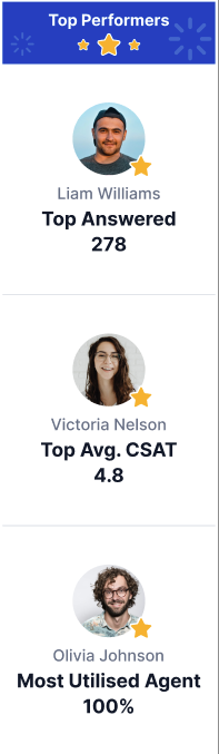 Name Range Description Top N Closed N in the range of 1–3 Shows agents with the highest number of closed conversations. Top N Answered N in the range of 1–3 Shows agents with the highest number of accepted conversations. Top N CSAT N in the range of 1–3 Shows agents with the highest CSAT. Top N Occupancy Rate N in the range of 1–3 Shows agents with the highest occupancy rate. Top N Average First Response Time N in the range of 1–3 Shows agents with the lowest Average First Response Time (FRT). -