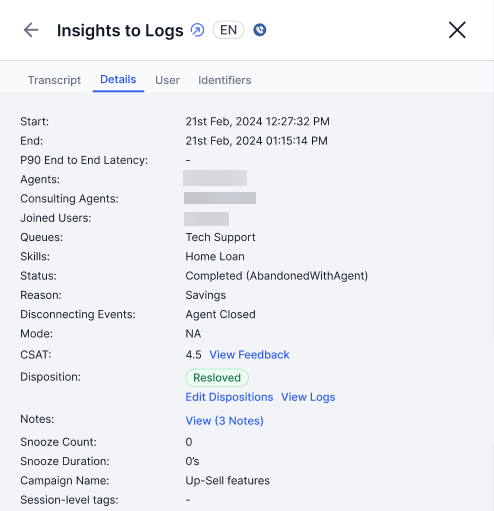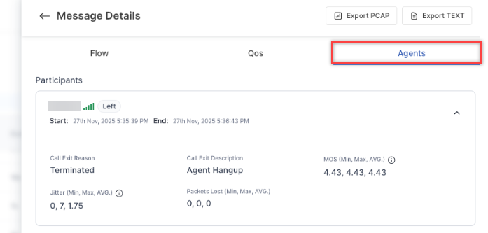 The Agents tab provides a per-agent view of participation and call quality metrics for a specific interaction. It helps you identify which agents joined the interaction, view their join and exit timestamps, understand how the call ended, and analyze call quality for each agent.