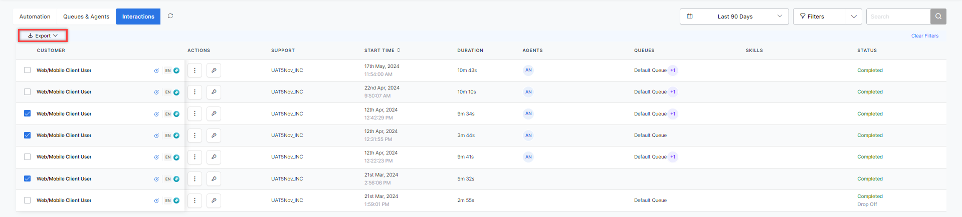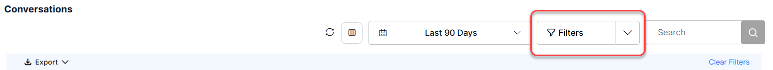 - You can select up to 25 conversations for transcript export. If a selected conversation doesn't have a transcript or the system cannot retrieve it, the export includes a blank transcript for that conversation.