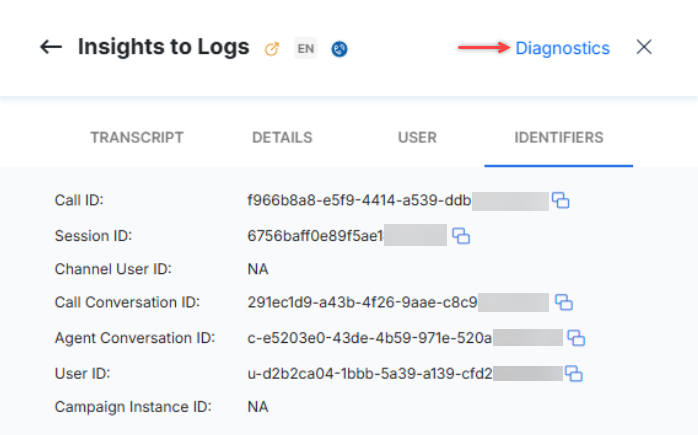 Access Diagnostics at the top-right corner of Insights to Logs.