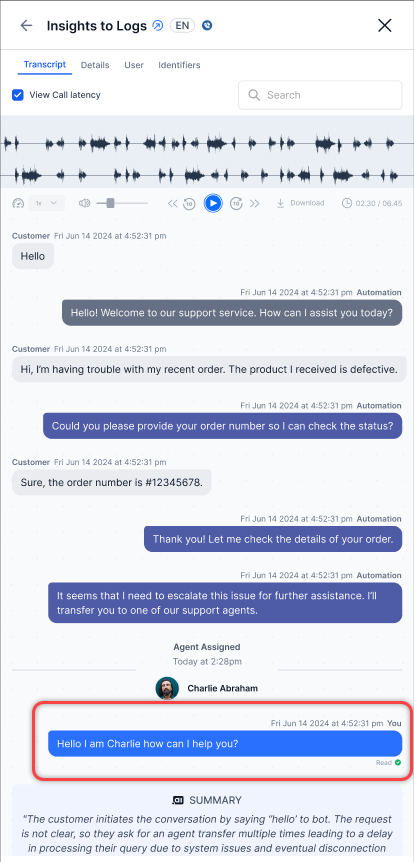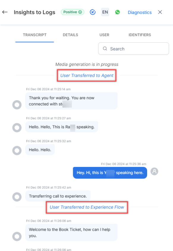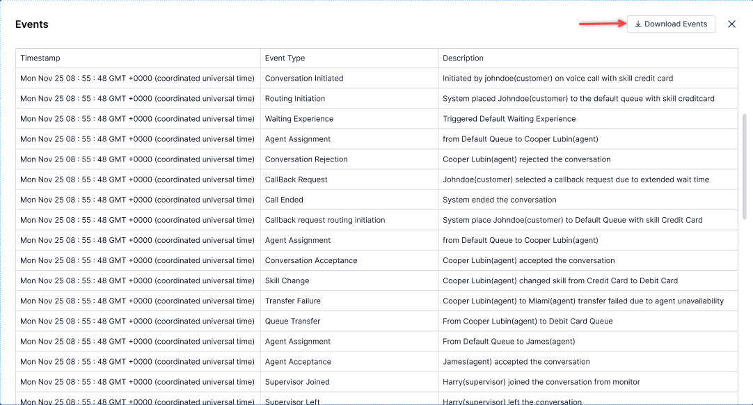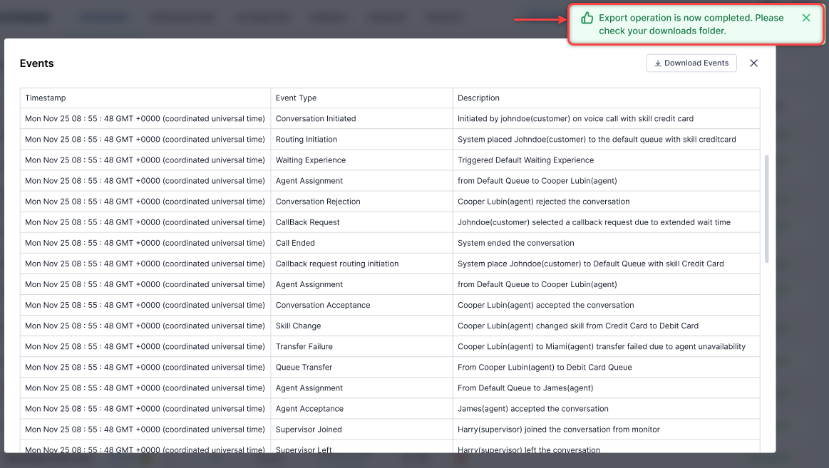 - Events are recorded periodically, so the exported document may not always reflect the entire event history. For a comprehensive record, it is recommended to download the events once the conversation has ended.