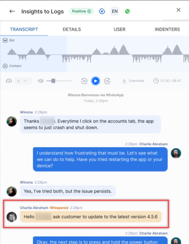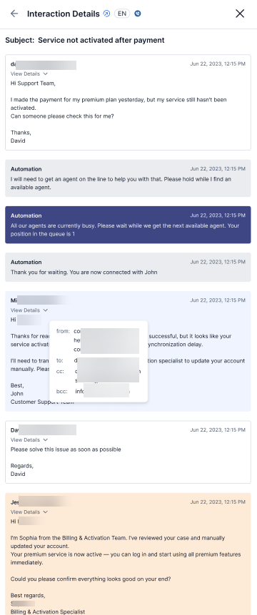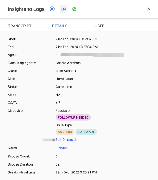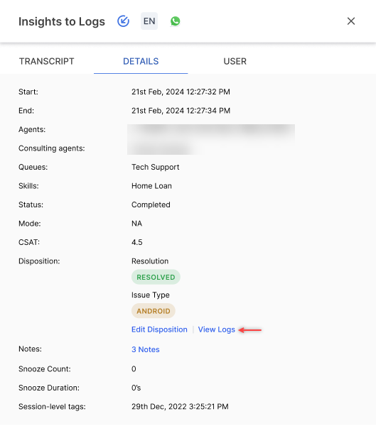 - Agents: The profile pictures of the agents who handled the conversation appears in the order in which they participated. Hovering over the profile pictures shows the names of the agents.