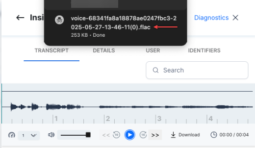 You can download the recording, transcripts, latency reports, and events to your local system from the dashboard.