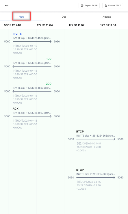 The Flow tab provides a detailed timeline of call signaling and media flow between endpoints. This interface displays the sequence of SIP messages and RTCP packets exchanged during a call, allowing Agents and Supervisors to track the complete communication flow and troubleshoot connection issues.
