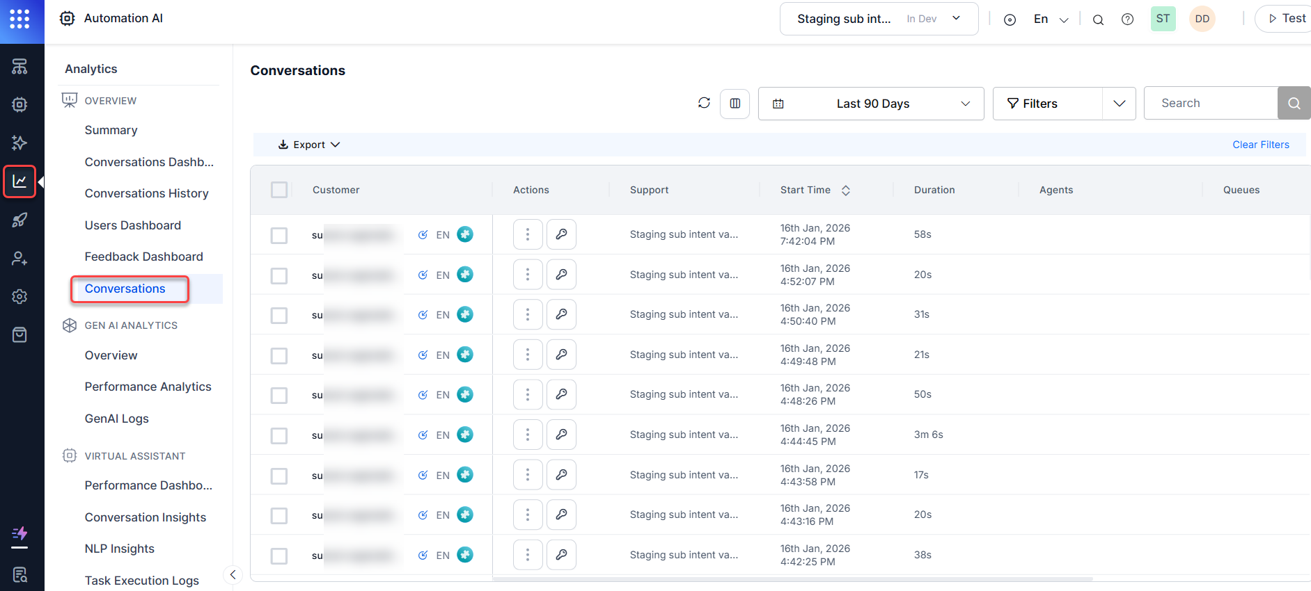 Conversations provides insights into the AI Agents Conversations. You can use the logs to review your AI Agent’s performance and troubleshoot issues with conversations.