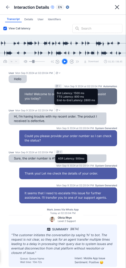 The Latency Metrics feature measures how long each stage of a voice interaction takes Automatic Speech Recognition (ASR), bot processing, TTS, and the overall end-to-end response time. The following sections define each metric with formulas and examples.