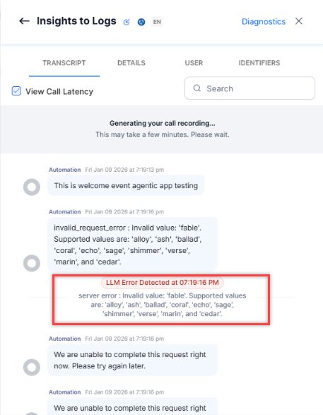 Export/Download Recording, Transcripts, Latency Report, and Events¶