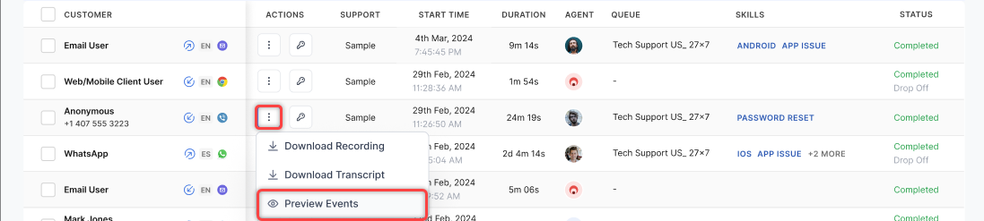 - Skills: One skill appears with a +N for more skills. Hovering over the skills shows all skills associated with the conversation.