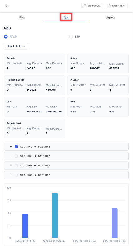 The QoS tab provides detailed network metrics for call monitoring and troubleshooting. It offers comprehensive data visualization of network performance indicators to help Agents and Supervisors analyze call quality.