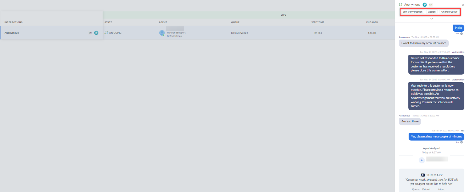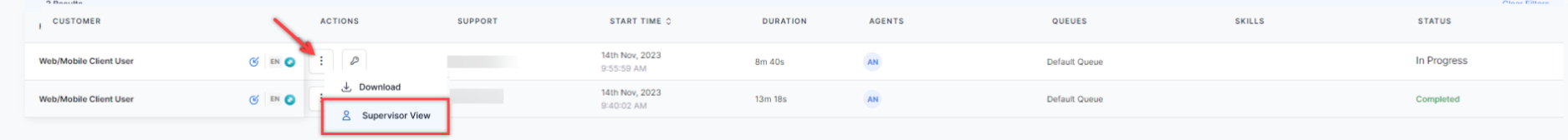 Supervisors can view ongoing Conversations on the Conversations tab. They can intervene as a supervisor, similar to the Monitor tab, and join, reassign, or change the queue of any interaction visible on the Conversations tab.